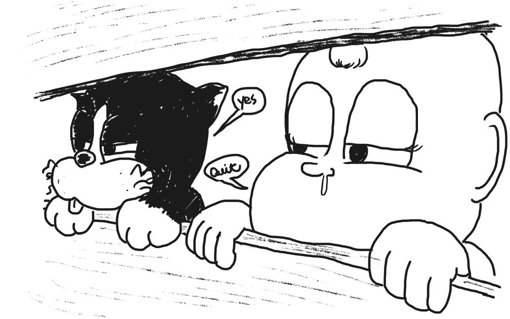 こっそり隠れて何見てるんでしょうか?そんな想像を起こさせるイラストのスウェットです。